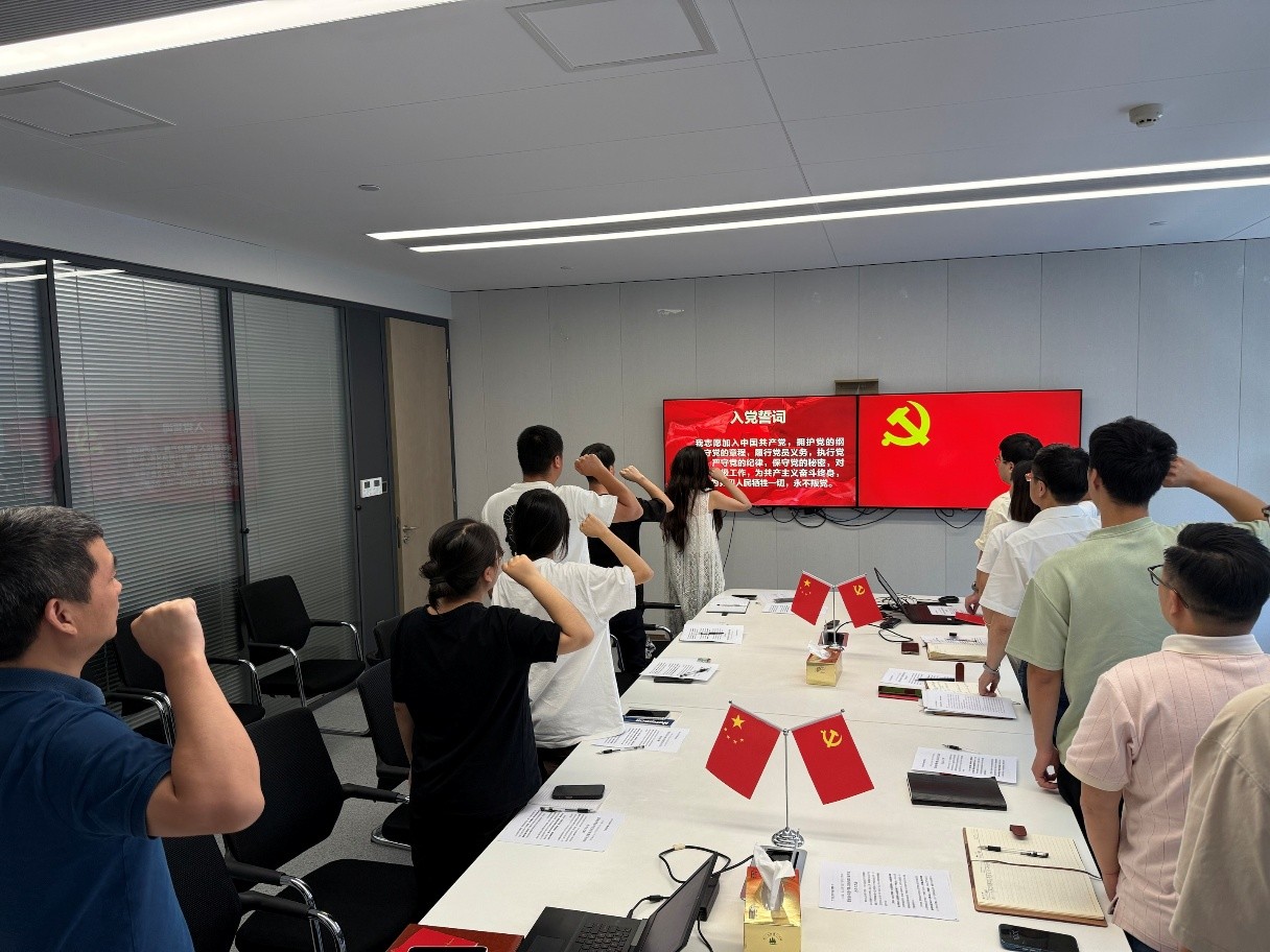 活動中,首先集中組織新老黨員進行入黨宣誓和重溫入黨誓詞,各黨員面對黨旗莊嚴宣誓,錚錚誓言、字字千鈞,這是黨員信仰的承諾,更是初心的回望。隨后支部書記作了題為《賡續紅色血脈守初心 ,勇擔時代使命促發展》的專題黨課,從三個方面進行講述,回望百年征程,感悟建黨精神,汲取信仰力量,立足本職崗位,強化責任意識,在實干中彰顯使命擔當,在能力提升中展現新作為。在杭州參加活動的黨員同志還收看了時代先鋒網黨史教育課件《同心共筑中國夢》視頻及重要理論文章。